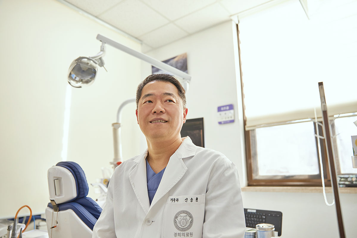신승윤 교수는 경희대학교 치과병원 치주과에서 환자들을 만나고 있는 교수이자 치과 전문의다.